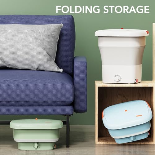 Zachte droogfunctie: de wasmachine is uitgerust met een zachte centrifugefunctie, die overtollig water automatisch kan verwijderen, de droogtijd verkort en het drogen van kleding versnelt. De mini-wasmachine is geschikt voor ondergoed, babykleding en handdoeken. Opvouwbare wasmachine, draagbare wasmachine voor kleding/sokken/ondergoed voor baby/meisjes.
