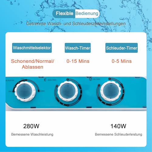Was- en centrifugefunctie: het ontwerp met dubbele trommel scheidt de wasfunctie van de droogfunctie. Met de draaiknop stel je de wastijd tot 15 minuten in en de centrifugetijd tot 5 minuten.